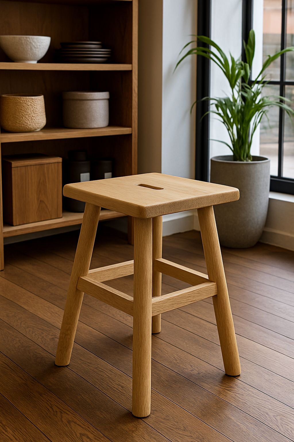 Son assise carrée est un clin d’œil aux tabourets d’atelier du XIXᵉ et XXᵉ siècle, utilisés dans les écoles de métiers et les ateliers d’artisans.